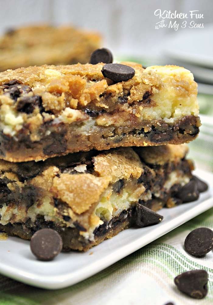 These Chocolate Chip Cheesecake Bars are delicious. I love this combination! The first layer is cheesecake and the top is chocolate chip cookies.