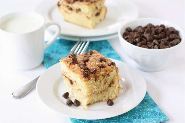 - 4. Slowly add in the dry ingredients. Mix until just combined. In a small bowl, make the cinnamon sugar topping/filling. Stir together sugar, brown sugar, and cinnamon. Pour half the batter into the prepared cake pan and sprinkle with half the cinnamon-sugar and half the chocolate chips. Spoon the remaining batter over the filling, spreading gently. Sprinkle with the remaining cinnamon-sugar and chocolate chips.