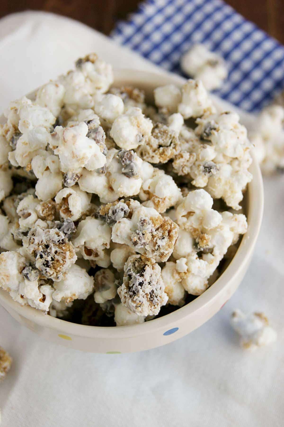 - Put the popped popcorn in a large bowl. Place the vanilla almond bark in a microwave safe bowl and melt according to the package directions. Pour over the popcorn. Add in the crumbled cookies and the mini chocolate chips. Stir gently to combine.