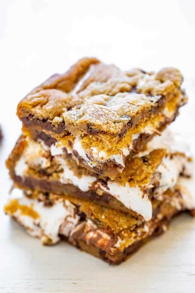 These s'mores cookie bars feature layers of super soft chocolate chip cookie dough, chocolate, marshmallows, and graham cracker crumbs!