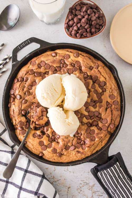 The Pizookie! Baking cookie dough in a skillet until it's golden brown and crispy on the edges, then topping it with scoops of vanilla ice cream while it's still warm for a gooey, indulgent dessert experience that combines the best flavors of chocolate chip cookies and texture of brownies.