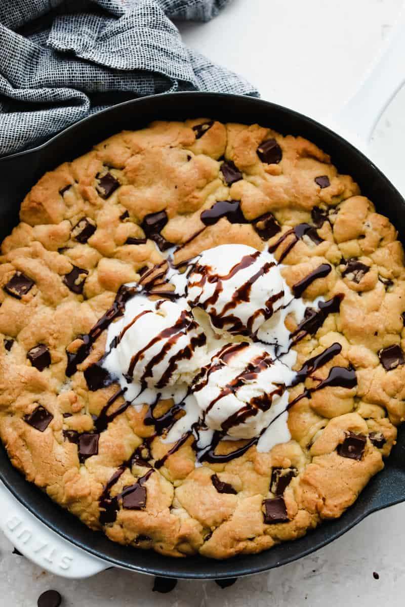 - Top the warm cookie with ice cream and enjoy eating it right out of the pan! Be careful because the pan will still be very hot.
