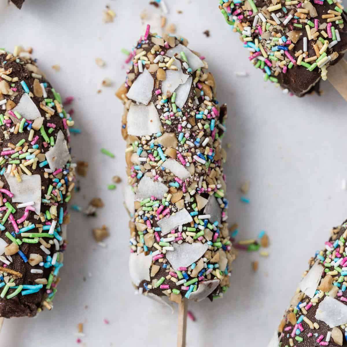 Half bananas in popsicle sticks dipped in melted dark chocolate and then topped with sprinkles, The banana pops are then frozen for 30 minutes and served cold.