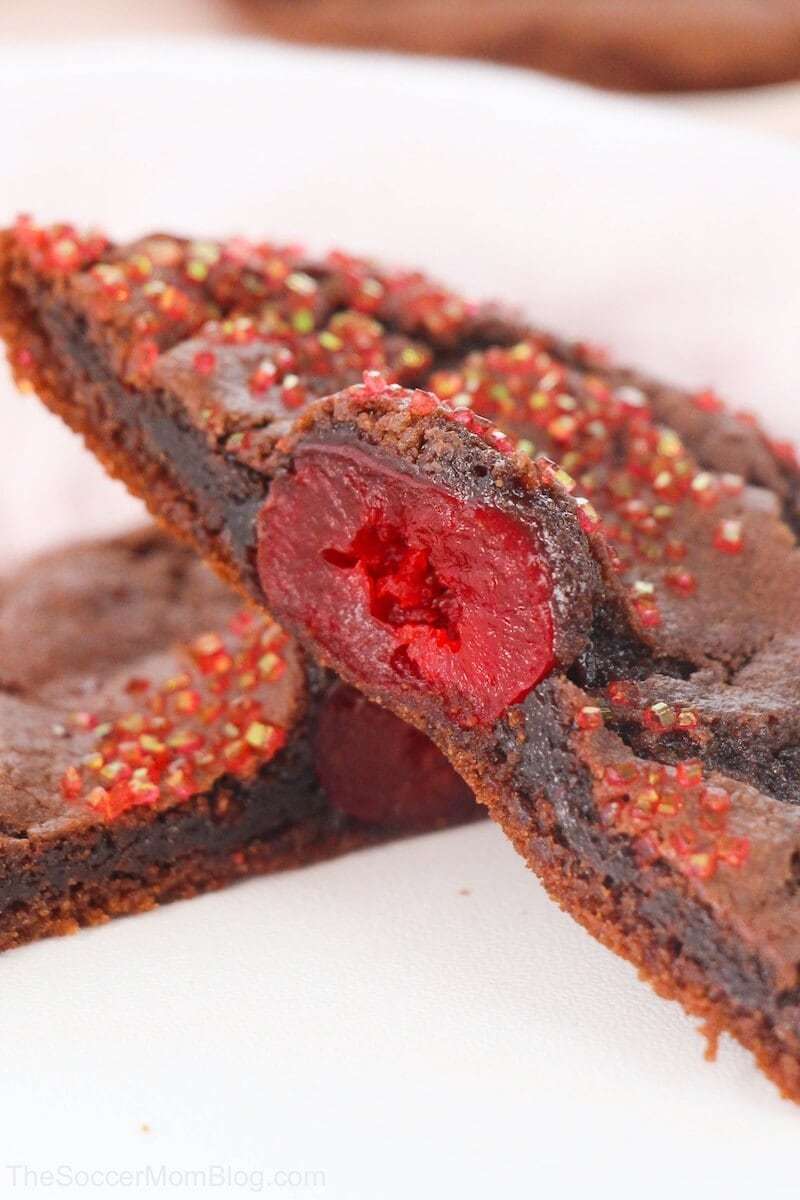 These chewy chocolate cherry cookies have a surprise inside! Rich chocolate cake mix cookies filled with sweet maraschino cherries!