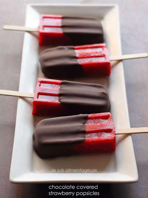 - To make the chocolate coating, use a short and narrow glass that is wide enough for you to dip in your popsicles. If the glass is too wide and you'll have to spend time dunking both sides of the popsicle in and you may drop some melted strawberry purée in and cause the chocolate to seize. Microwave for about 30 seconds, stir well, then another 15 seconds (the chocolate chips may not look melted yet). Stir until chips are fully melted and let the chocolate cool until it's just barely warm, stirring occasionally.