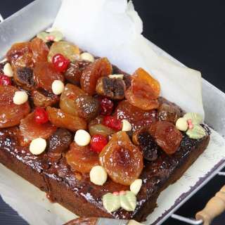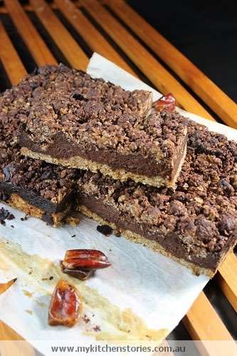 - Press one of the 1/2 mixtures into the base of the tin. spread the dates on top and crumble the remaining mixture onto the top . The darker mixture bottom or top it doesn't matter