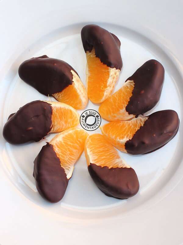 - Dip the orange slices into the chocolate, and wiggle them a little bit in the chocolate to create a smoother line of chocolate against the flesh of the orange and to make sure that the chocolate sticks. Gently shake off as much chocolate as you can (about 1-2 tbsps) or else you'll have too much chocolate on the orange piece.