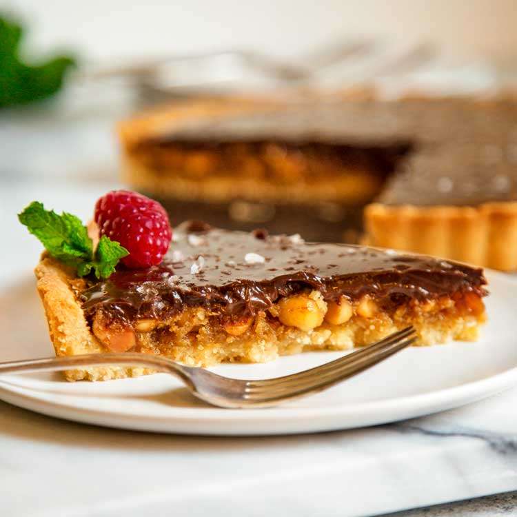 - Place chocolate in a mixing bowl. Pour warmed cream over and cover for 5 minutes. Stir to combine and is smooth. Pour and spread over cooled macadamia nut tart. Top with sea salt flakes. Refrigerate for 1 hour to firm ganache and tart.