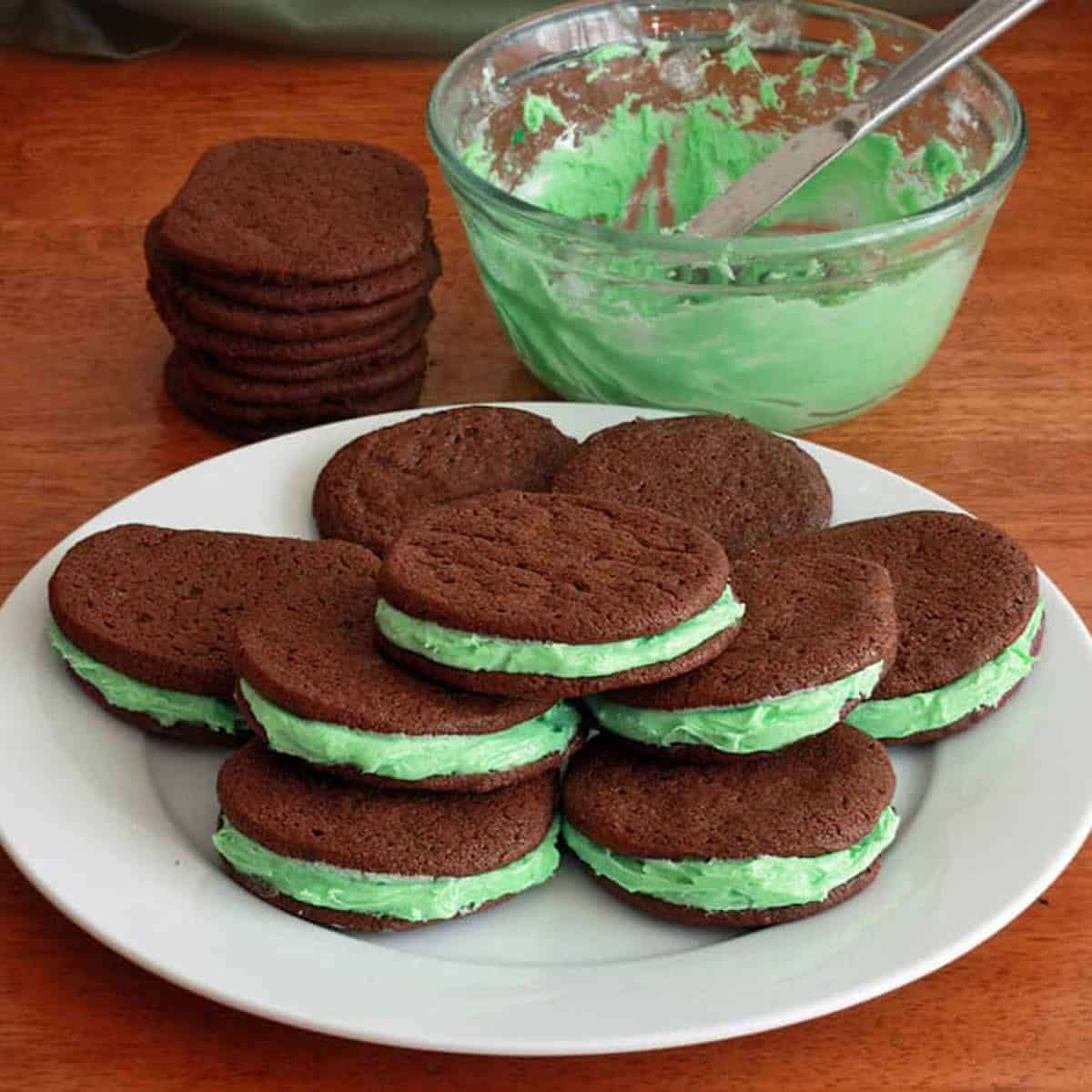 - To make the filling, add the butter, marshmallow cream, and mint extract. Use an electric mixer to beat until thoroughly combined and add green food coloring according to your desired shade of green. Spread about a tablespoon of the filling on the bottom side of one of the cookies and then place the other cookie on top. Repeat for all of the cookies.Makes about 24 sandwich cookies.