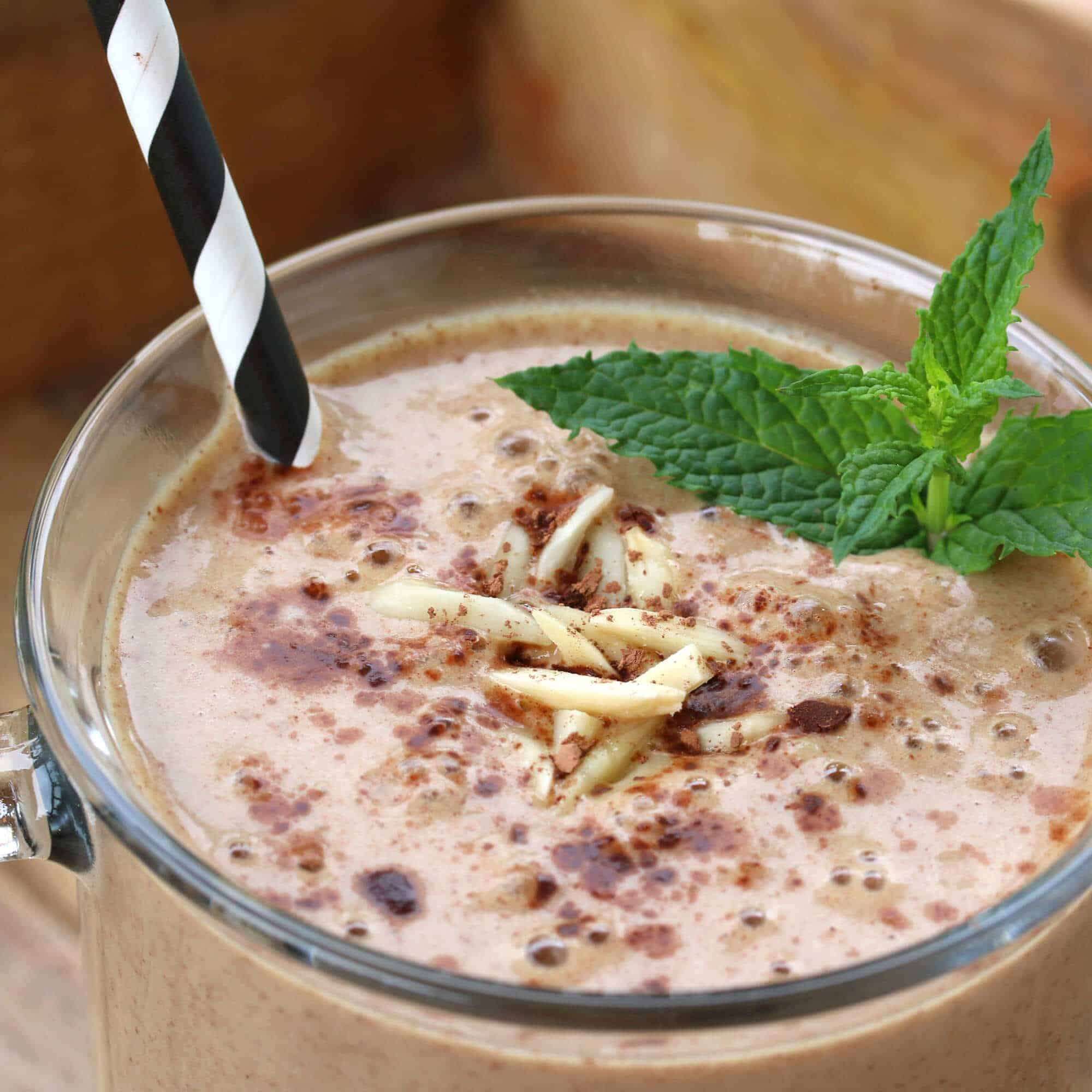 - Place all ingredients in a blender and blend until smooth. Pour into a large glass. If desired, garnish with some sliced or slivered almonds, a sprinkling of cocoa powder and a sprig of mint. Serve immediately.