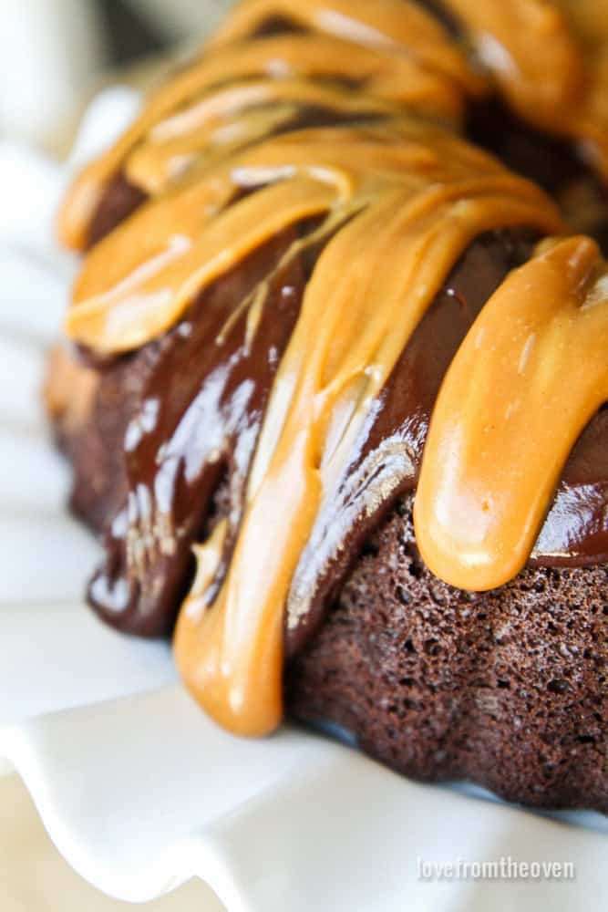 - 5. Bake for 50-55 minutes or until toothpick inserted into cake comes out clean. Remove from oven and allow to cool on a wire rack. Remove from bundt pan and top with powdered sugar or chocolate and peanut butter glaze if desired.