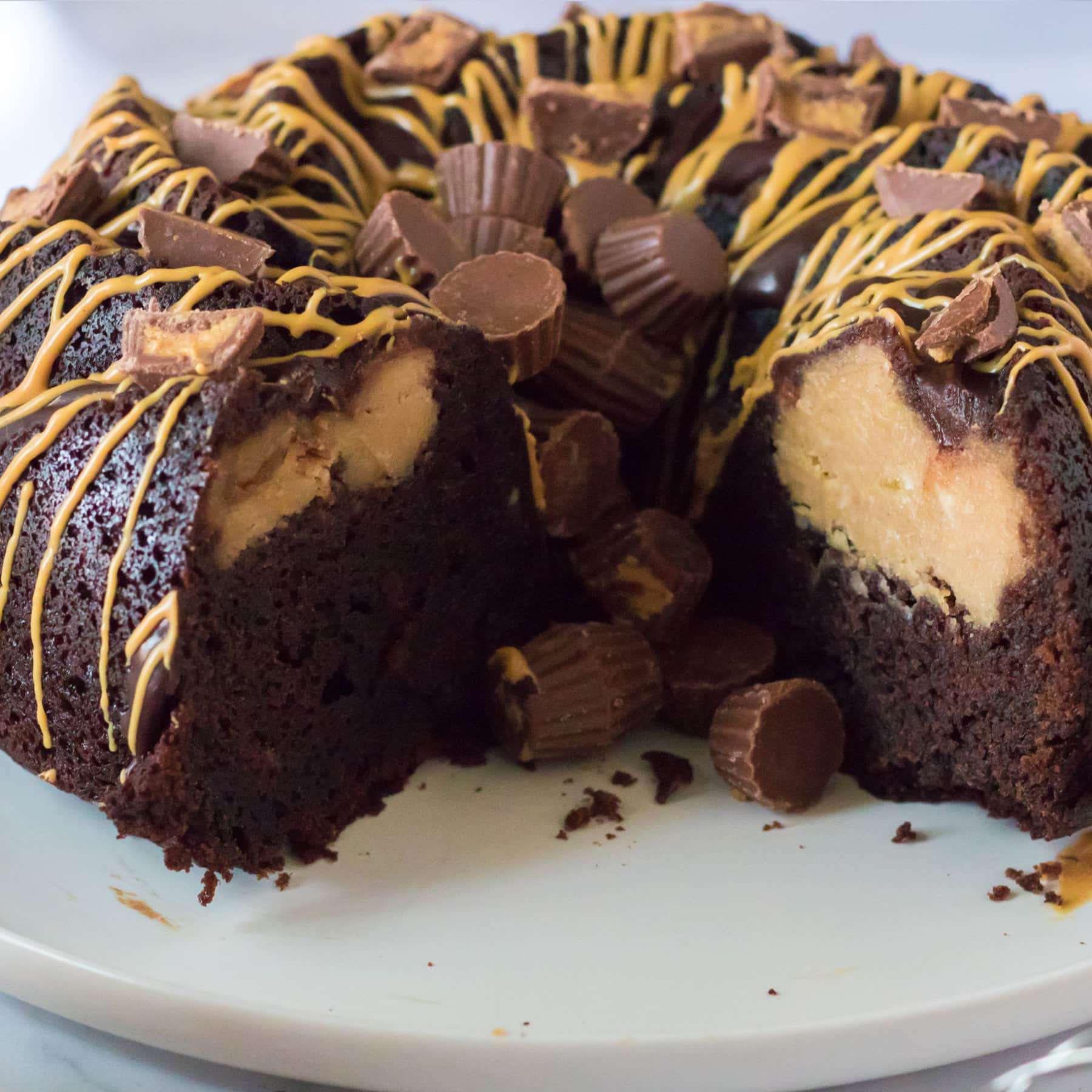 This Chocolate Peanut Butter Bundt Cake is a rich chocolate/brownie cake batter with a peanut butter cheesecake filling, topped with a peanut butter glaze and Reese's peanut butter cups.