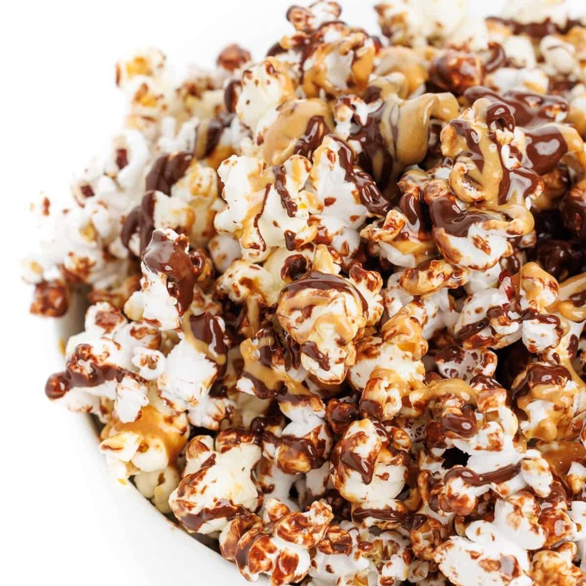 - Repeat step with peanut butter by heating it in a microwave-safe bowl until melted, 20-30 seconds. Drizzle peanut butter over the popcorn. Serve warm!
