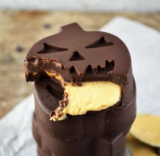 - Meanwhile mix the peanut butter, icing sugar and salt together until smooth. After 15 minutes remove the moulds from the freezer and spoon 1 tsp of peanut butter into each pumpkin. Smooth the peanut butter mixture out as smooth as possible then place back in the freezer for another 15 minutes.