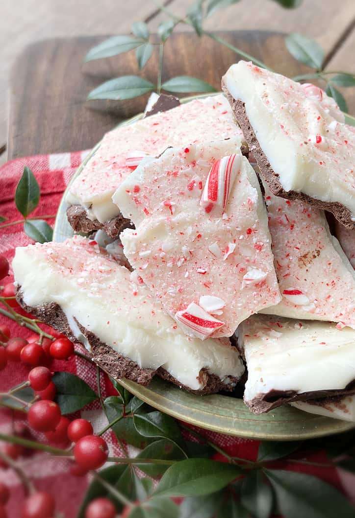 - In a different medium sized bowl, microwave the white chocolate chips for 2 minutes. Stir well, then heat in 1 minute increments until the chocolate is melted through and smooth. Pour over the set chocolate and spread out with the spatula to completely cover the darker colored chocolate. Sprinkle with the crushed peppermints. Press any larger pieces down into the chocolate.