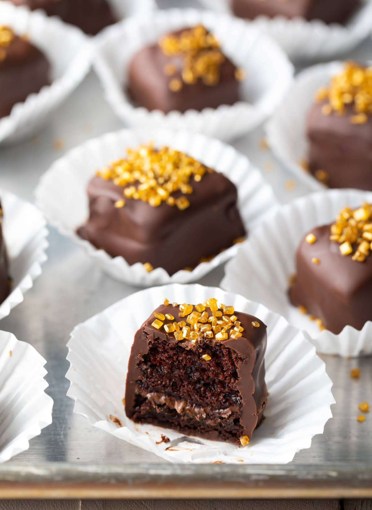 Whimsical and sweet chocolate mini cakes filled with Nutella and coated in melted chocolate. Petit Fours are easier to make than you might think, and are great for customizing with colored sprinkles!