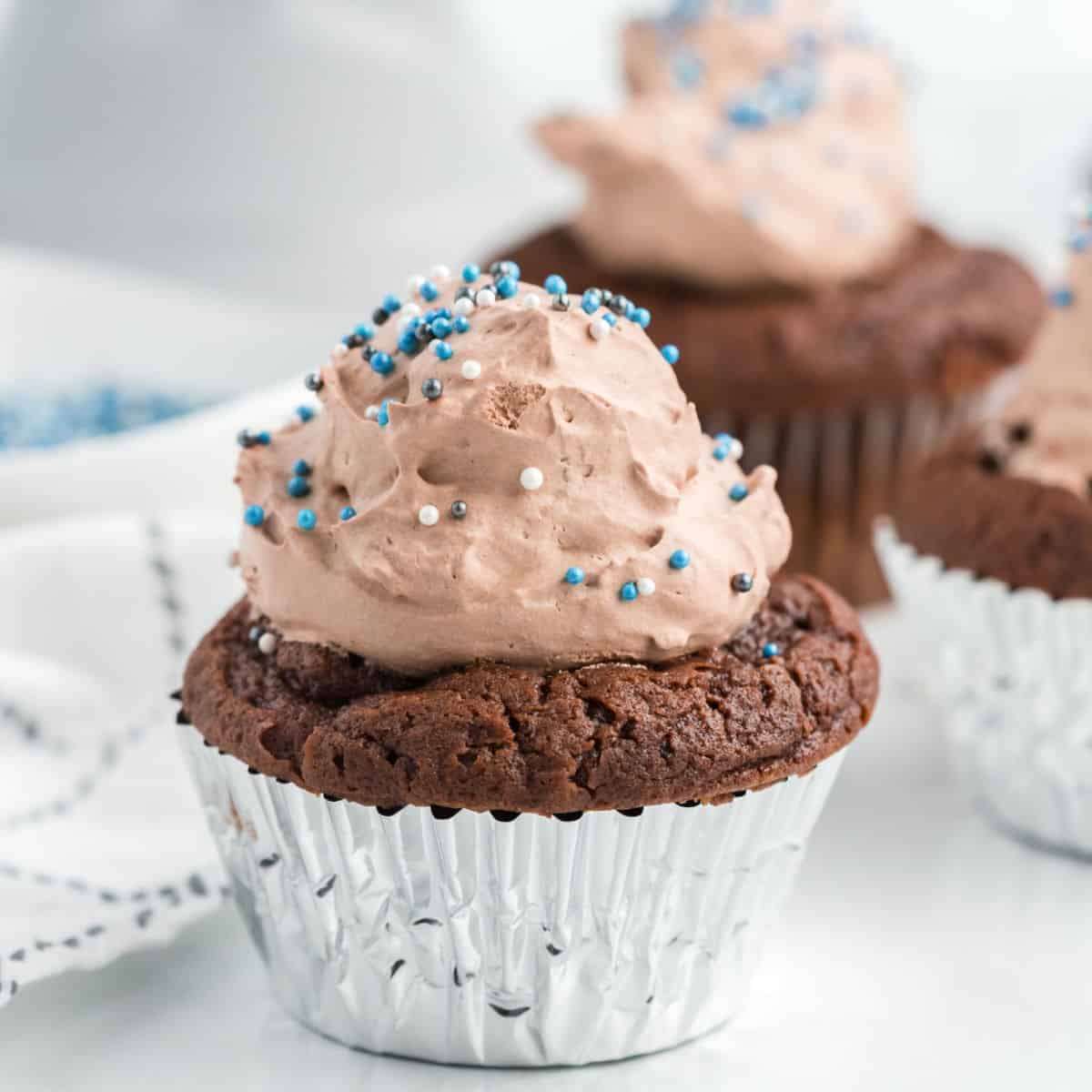 - Using a cookie scoop, dollop the frosting onto the completely cooled cupcake and add sprinkles for garnish. Store in refrigerator for up to 3 days, ENJOY!