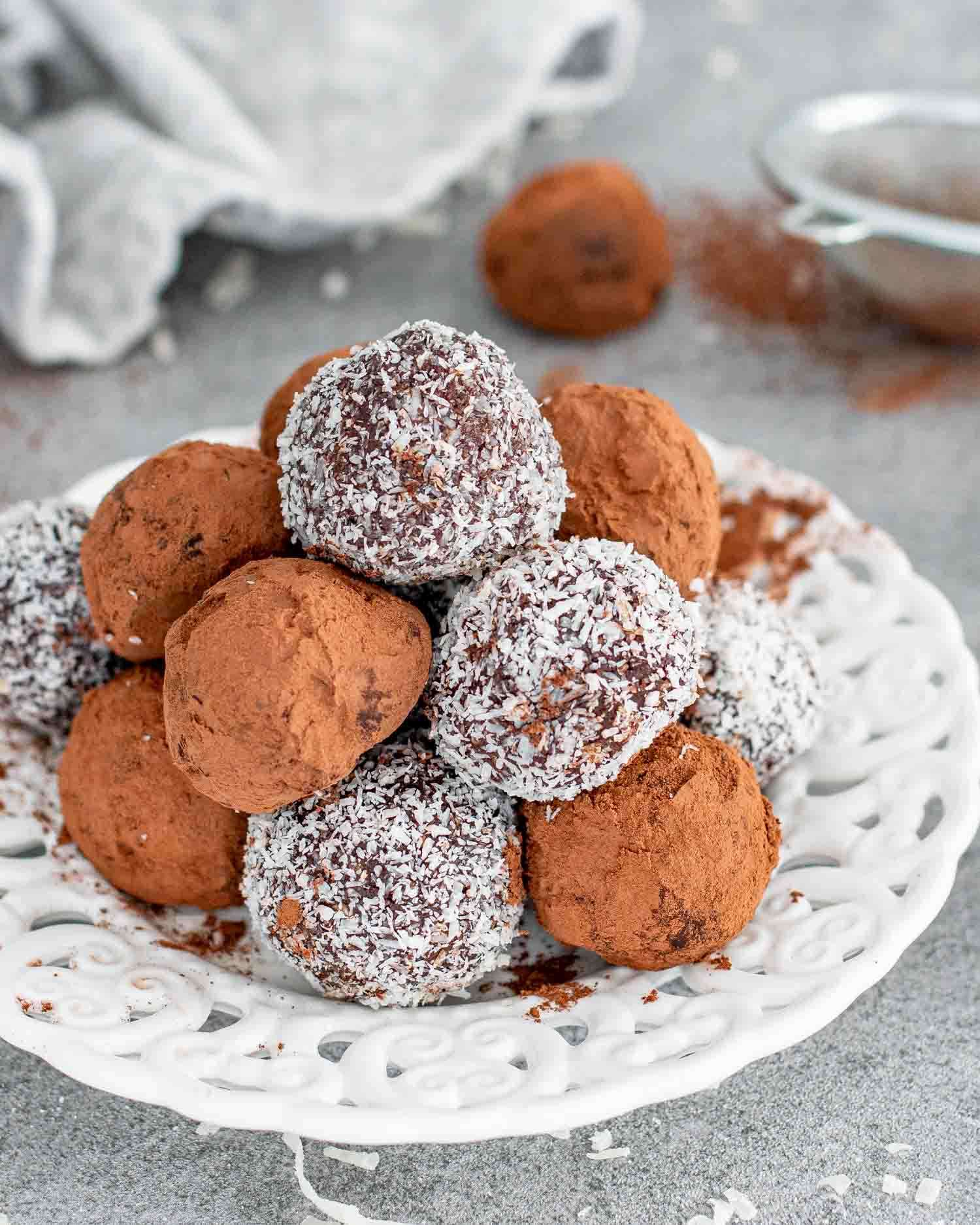 - Place the cocoa powder and finely shredded coconut in separate shallow dishes. Roll half of the truffles in the cocoa powder until well coated. Roll the other half in the shredded coconut until well coated.