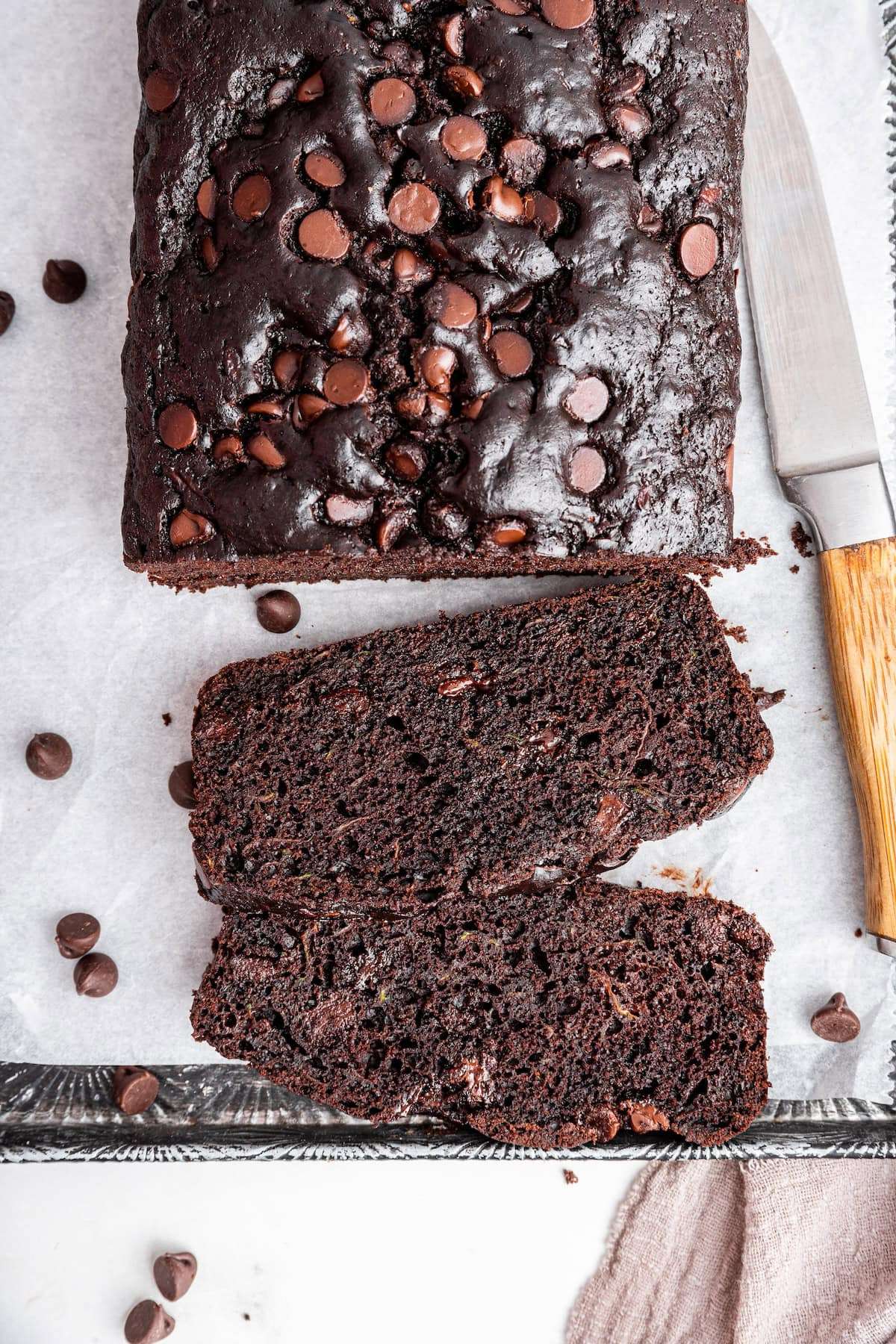 - Pour batter into the prepared loaf pan. Top with additional chocolate chips if desired. Bake for 45-50 minutes, or until a toothpick inserted in the middle comes out clean. Remove loaf from pans and let cool on a wire rack before slicing.