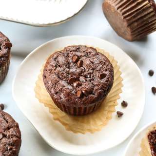 Chocolate zucchini muffins are made healthier with whole wheat flour, Greek yogurt, coconut sugar, coconut oil, shredded zucchini, and other pantry staple ingredients.