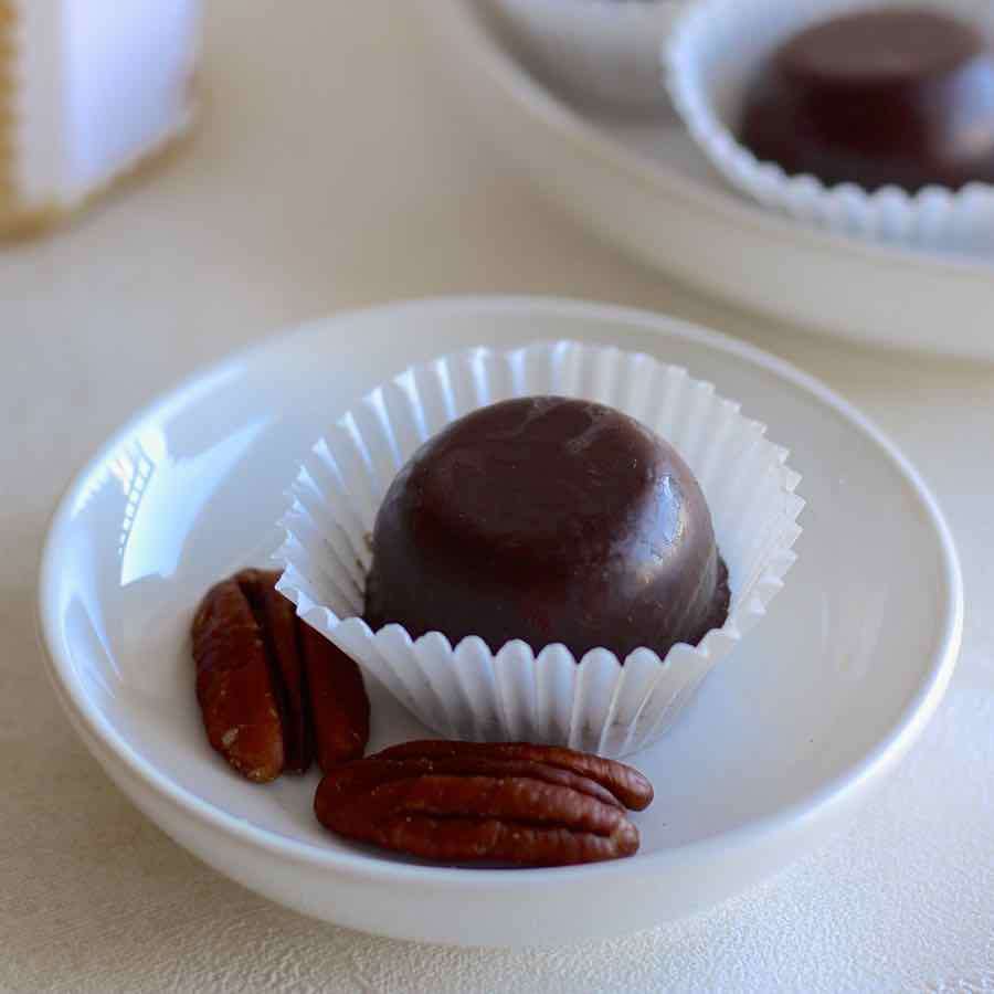 - Once the chocolate is solidified, place a teaspoon of milk jam and place a kernel of pecans and ½ teaspoon grated coconut over it.