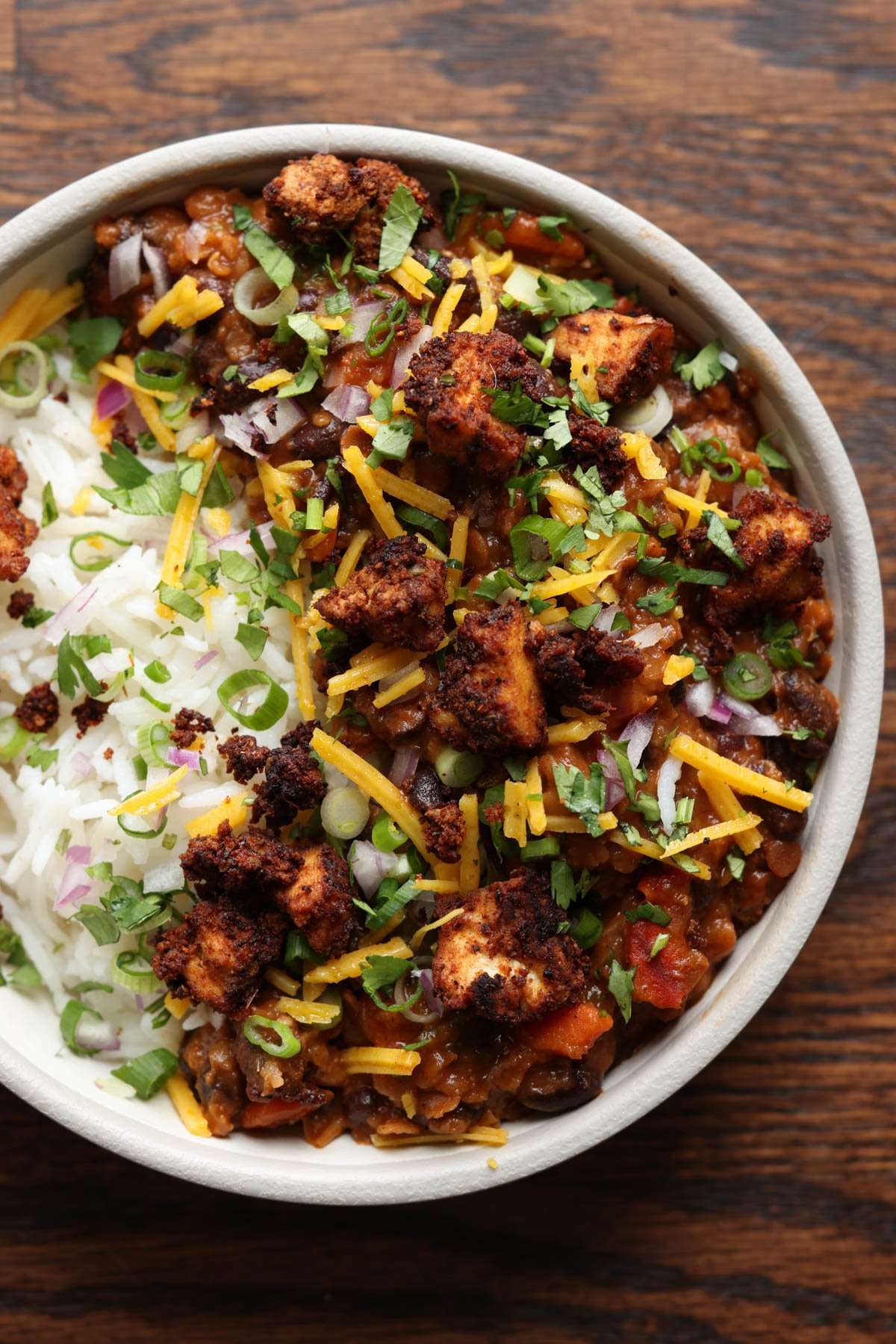 This tofu burrito bowl is packed with flavor from chorizo-style tofu and this incredible mixture of stewed black beans and red lentils. Serve over rice with your favorite burrito fillings, like cilantro, salsa, and vegan cheese or sour cream.