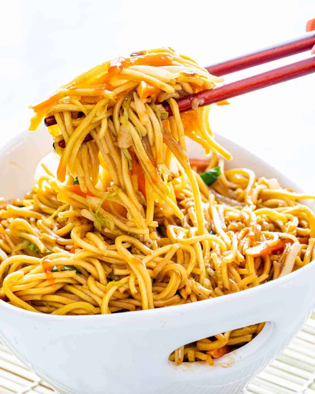 Delicious Chow Mein ready in just 15 minutes, easy to put together, all in one pot and always a crowd favorite! A homemade version of your favorite take-out dish, vegetarian style or add the protein of your choice!