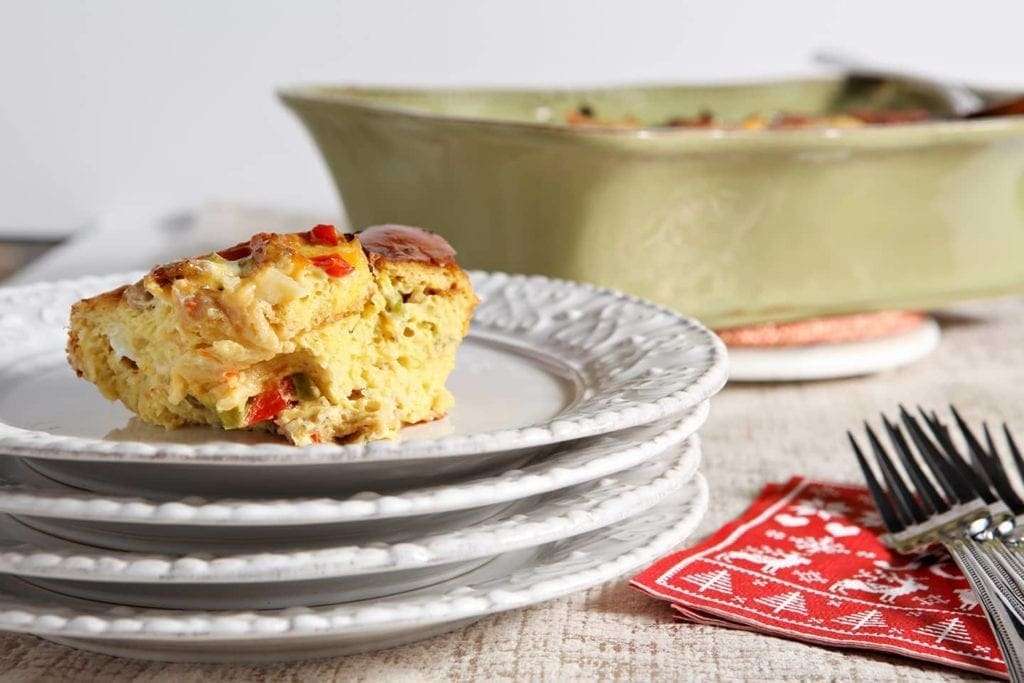 Christmas Breakfast Casserole is the perfect savory breakfast to enjoy on Christmas morning. This make-ahead casserole features eggs, bread, breakfast sausage, red and green bell peppers, onions and cheese.