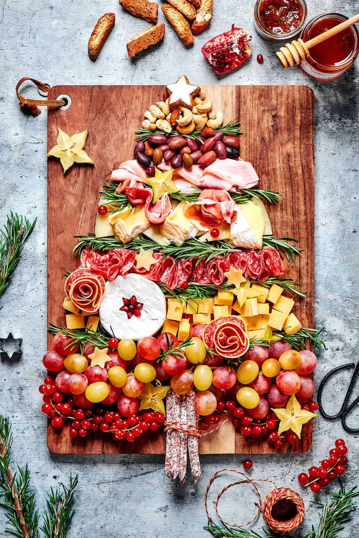 - Then arrange a tree on a vertically-oriented rectangular board. Build yourtree starting from the bottom with a row of red currant at the base. Thenadd lines of red and green grapes, cubed gouda, Classic Camembert, anddifferent types of salami and cheese. Keep layering in with Ham, Prosciutto,salami, olives, and nuts. The order is not strict - be creative and have fun - arrange the ingredients as desired in the shape of a Christmas tree. Make sure each layer of Christmas tree is slightly less wide than the last to ensure the triangle tree shape. Stick little sprigs of rosemary in between layers to look like pine needles.