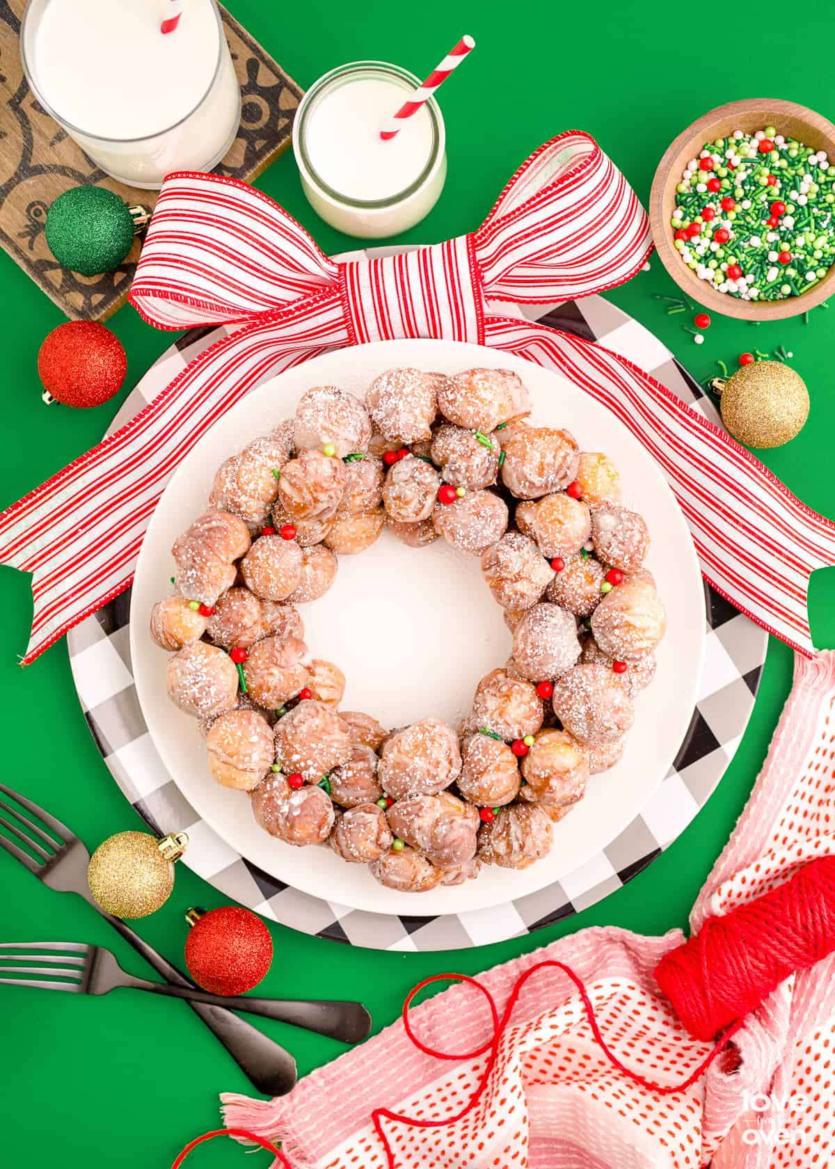 The sweetest Christmas wreath you'll ever see! Made of freshly made donut holes, this fun wreath is perfect for a Christmas breakfast.