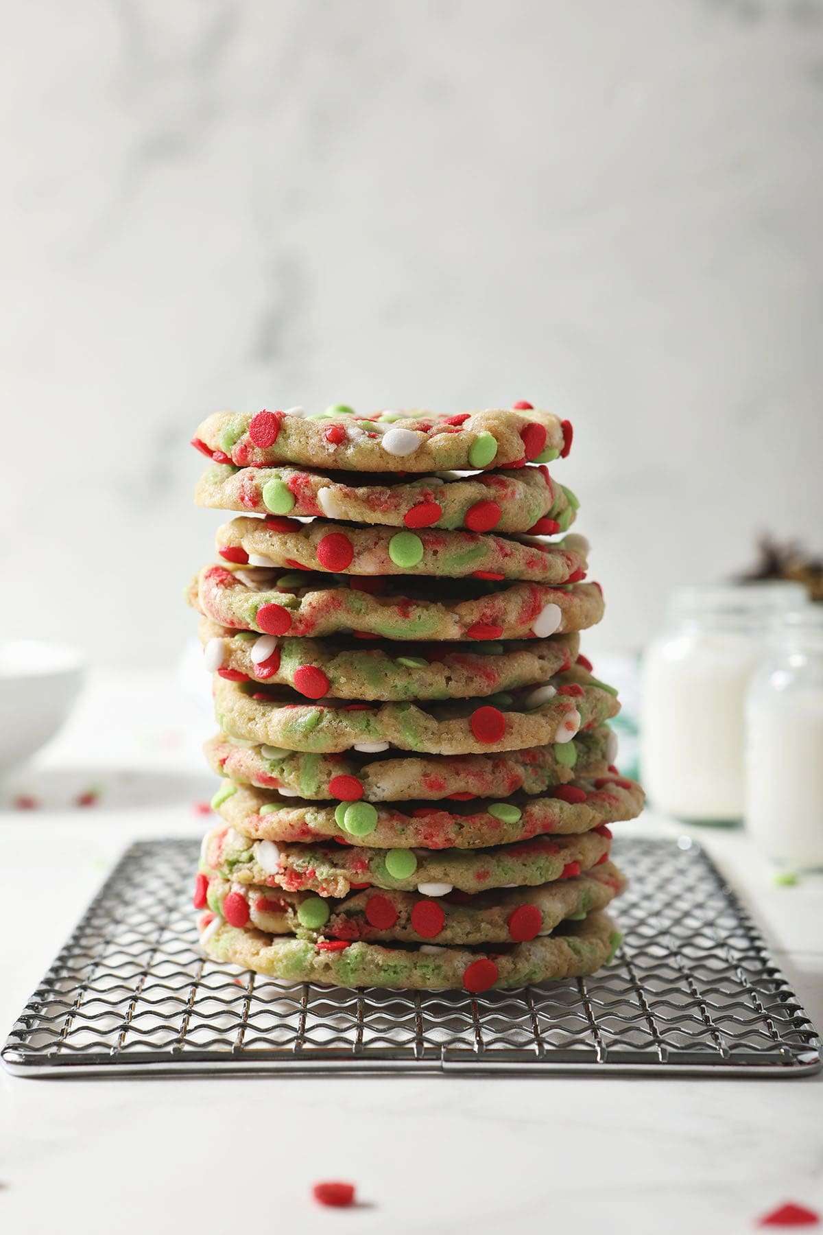 Christmas Funfetti Cookies are a fun twist on a classic cookie recipe, that’s a nod to everyone’s favorite childhood boxed cake mix. These festive confetti cookies have a nice crunchy exterior, a soft interior and are chock full of Christmas-colored sprinkles. They’re perfect for cookie platters, Santa and any occasion this season!