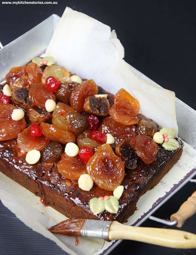 - Decorate by painting with conserve (jam) and then pressing the glace fruit onto the top.