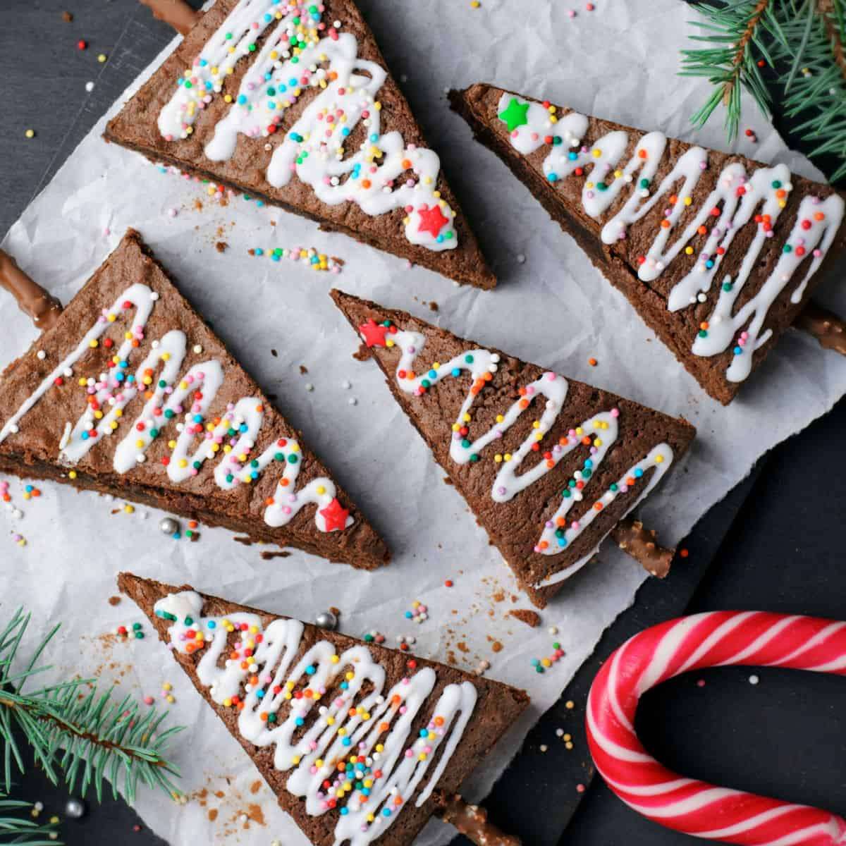 - Use the parchment paper to lift the brownies from the pan. Cut the brownies into 8 triangles (see image). Place a biscuit stick into the bottom of each tree for the trunk.