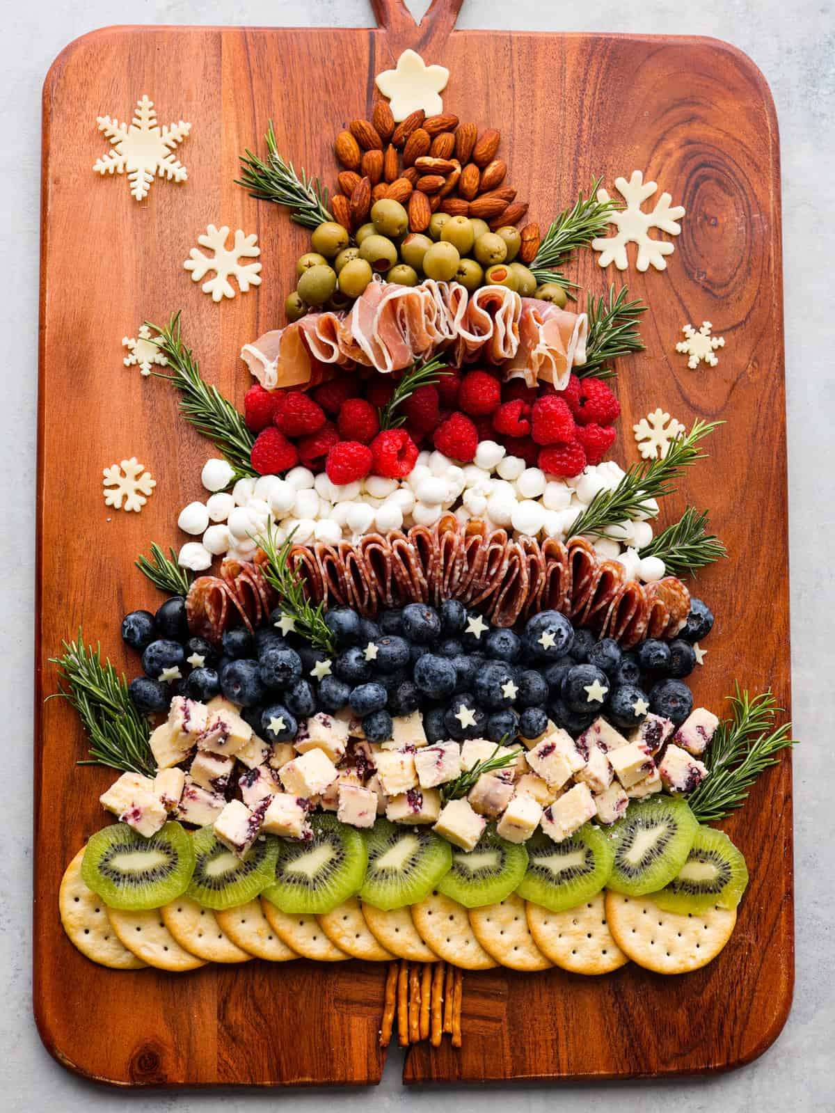 The cutest addition to any holiday party, this Christmas tree charcuterie board is both festive and delicious! It features a delicious mix of salami, prosciutto, cheese, fruits, and nuts, with rosemary sprigs as tree branches! It almost looks too good to eat.