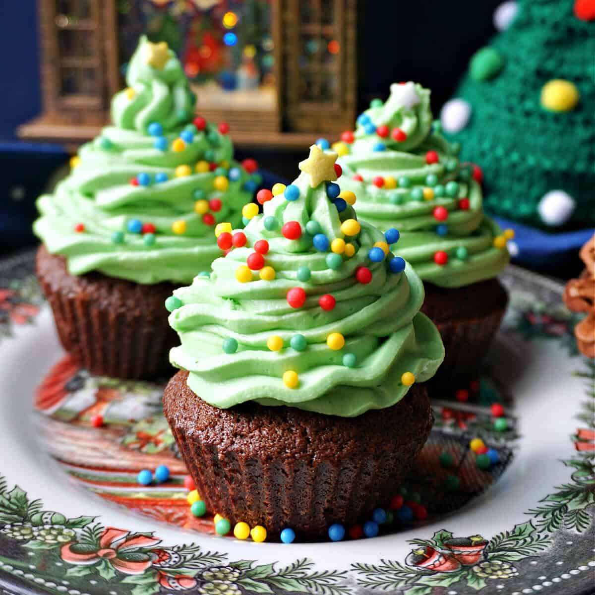 Christmas Tree Cupcakes made with a chocolate sponge base, green vanilla buttercream frosting and sprinkles, a delicious and indulgent Christmas dessert to enjoy during the whole of the festive season. It's a quick and easy to make treat made with easily-available ingredients - the chocolate sponges are moist and chocolatey, while the buttercream is rich and smooth with sugar decorations that resemble baubles. A fantastic family-friendly dessert!