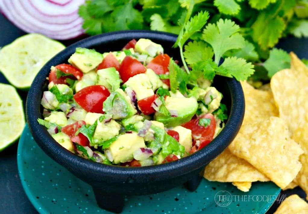 Chunks of avocado, tomatoes, onions coated in lime juice. Eat with tortilla chips or top on chicken, fish or beef.