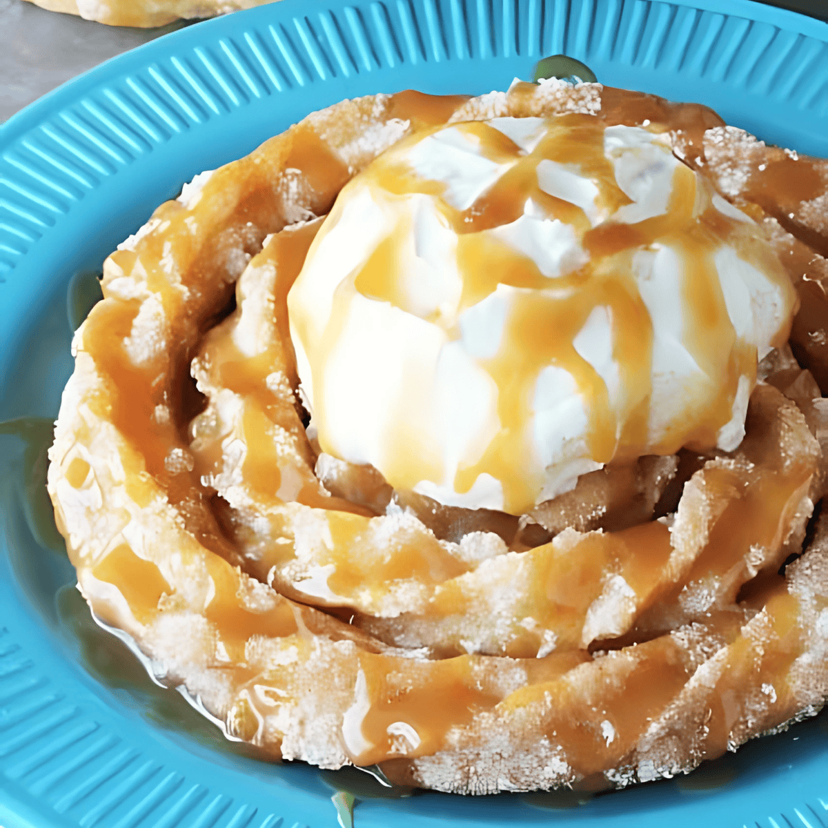 - Serve the funnel cakes immediately. Top each one with a generous dollop of whipped cream and a drizzle of caramel sauce