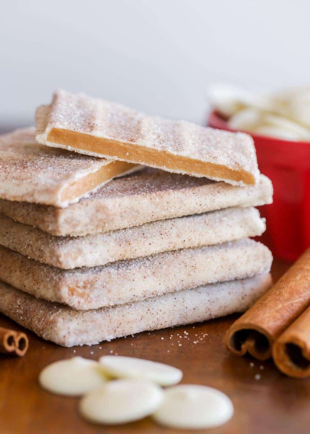 It's one of our favorite treats to pick up at the Happiest Place on Earth - Churro Toffee! These toffee squares are dipped in white chocolate and covered in cinnamon and sugar.