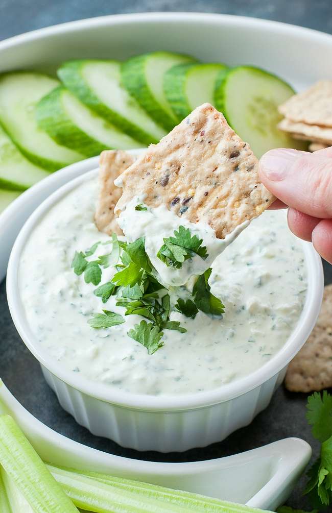 - NO FOOD PROCESSOR? No problem! A blender will work just fine and, for an appliance-free dip, feel free to use a box grater to coarsely grate the cucumber, then simply smash + mince your garlic and finely chop your green onion and cilantro before adding them to the dip. Easy peasy!