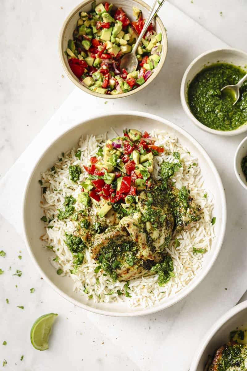 Juicy chicken thighs are saturated with a fresh herb sauce and loads of seasoning. These get topped off with a bright, zesty salsa.