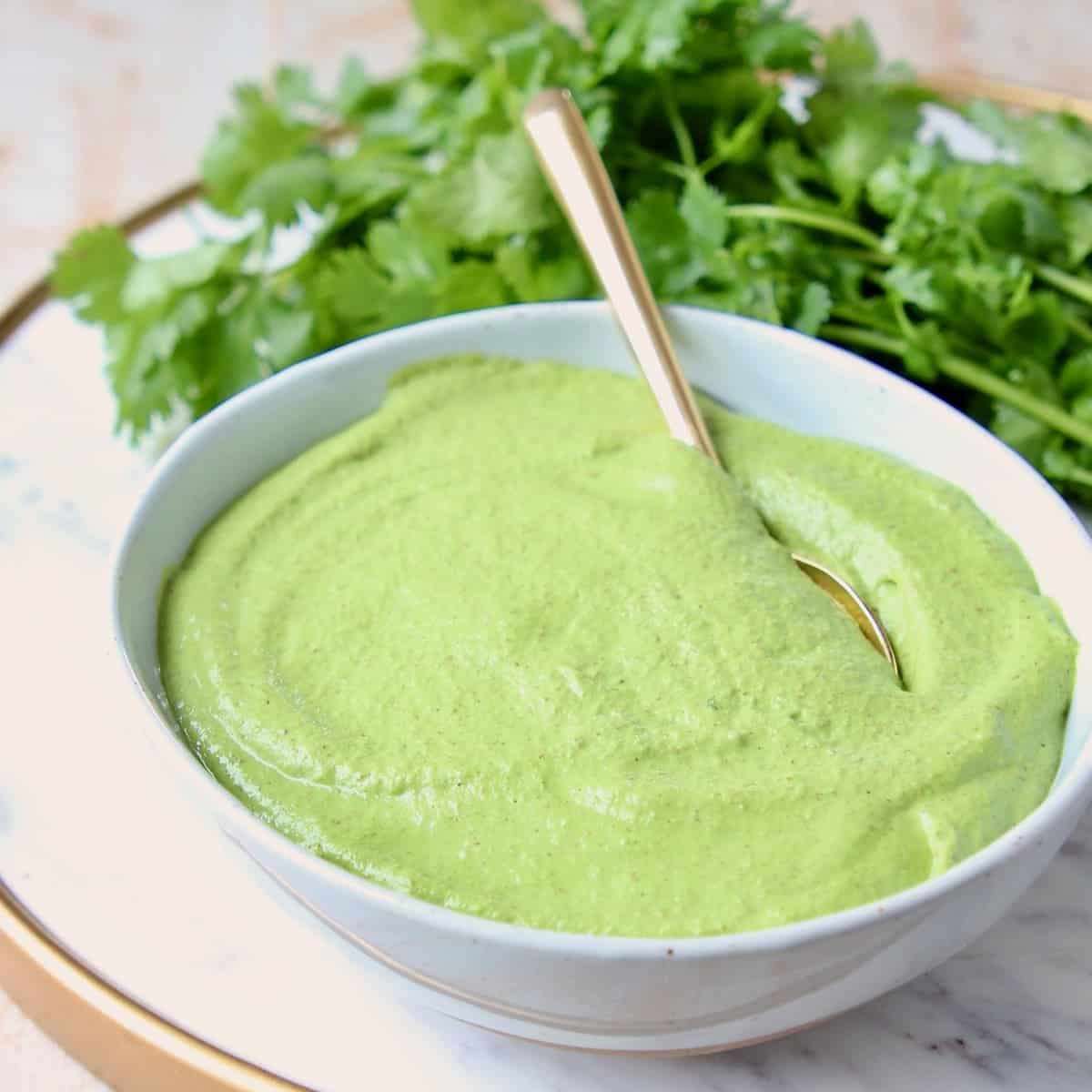 This cilantro pesto recipe is vegan, gluten free & paleo, it's perfect for adding to rice or pasta, or for topping tacos, grilled chicken, steak or pork!