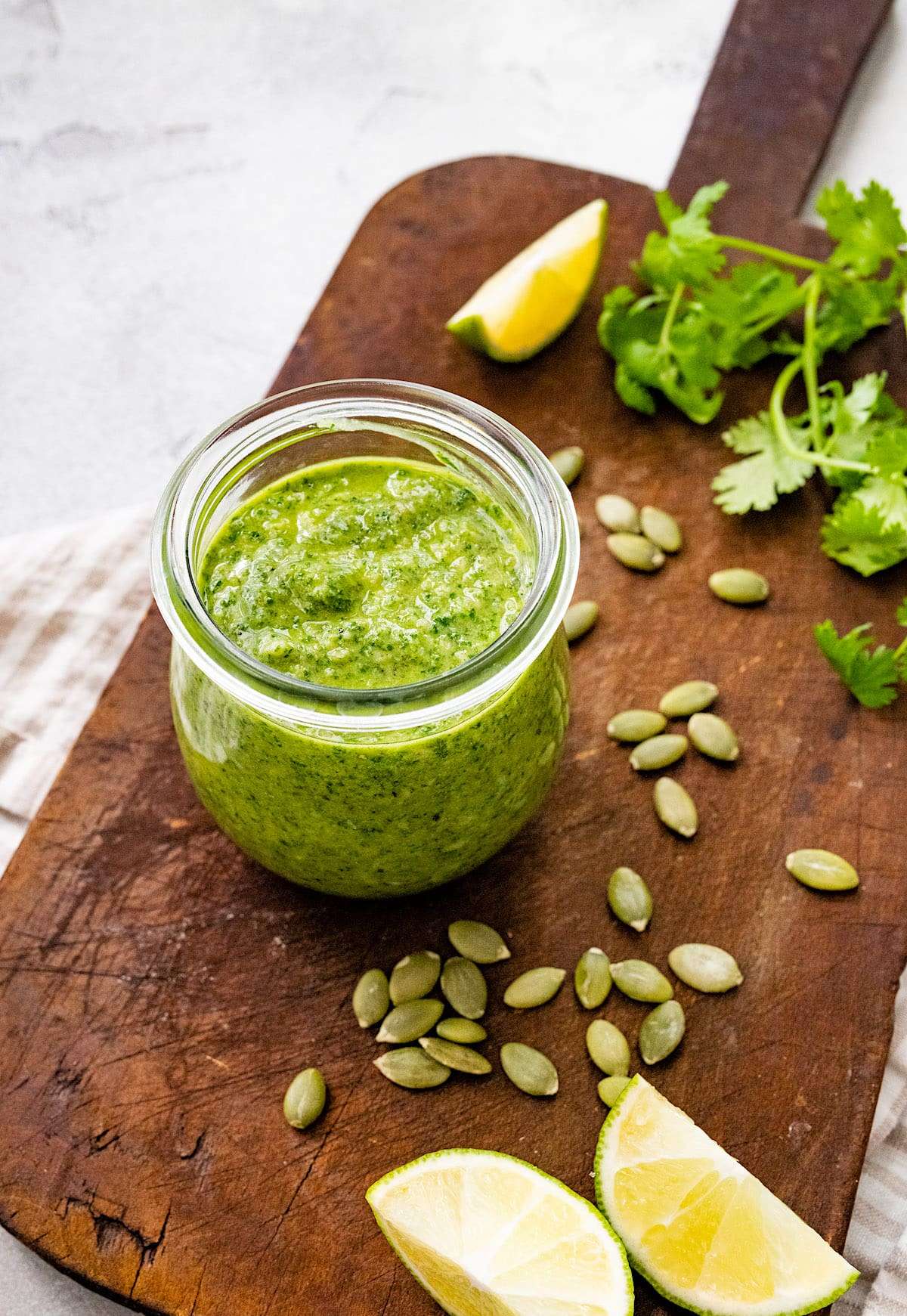 Easy homemade cilantro pesto made with fresh cilantro, pepitas, olive oil, lime juice, and garlic. Serve with grilled meats, tacos, vegetables, eggs, salads, and more!