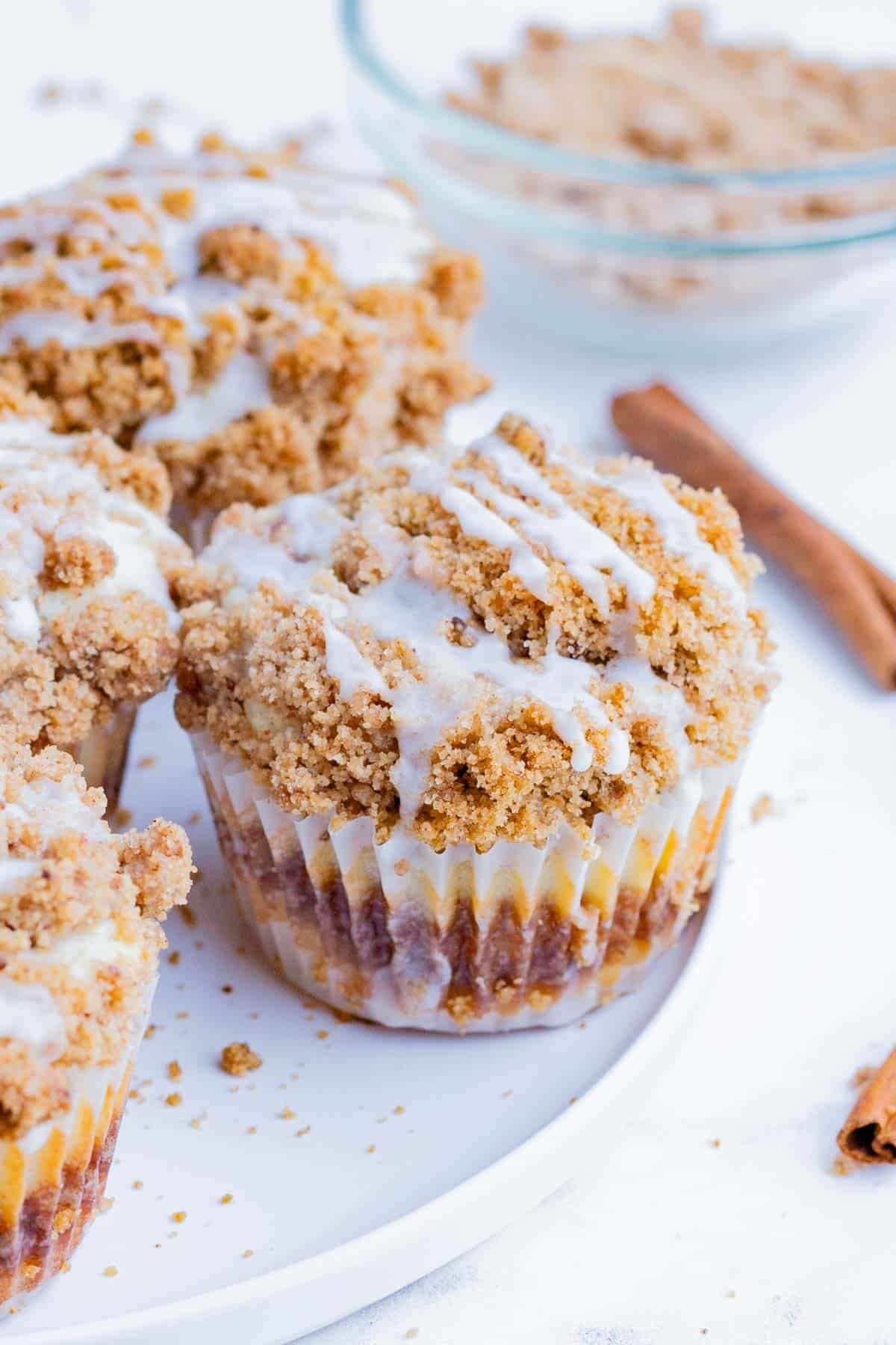 - Reheating: You can warm these coffee cake muffins up in 15-second intervals in the microwave. Or, you can place it back in a 250℉ oven. However, the glaze might melt into the cupcakes.