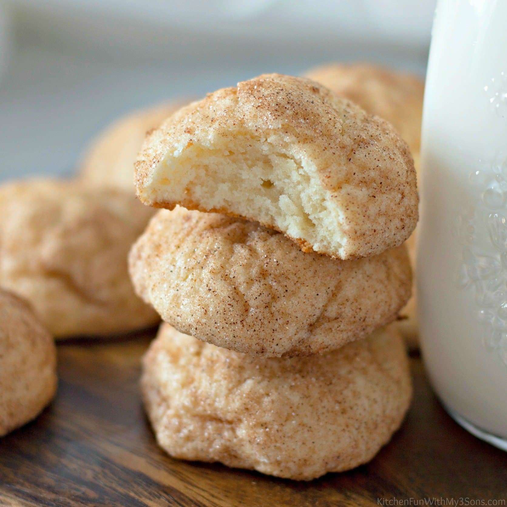 - Scoop the cookie dough into 1-inch dough balls and roll between your hands to create smooth dough balls. In a small bowl, combine the granulated sugar and cinnamon. Roll each dough ball in the cinnamon-sugar mixture, then place on the prepared cookie sheets with at least 1-inch of space between each.