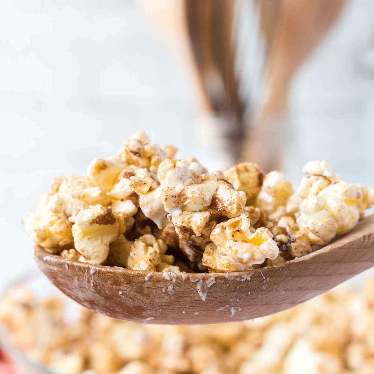 Cinnamon Roll Popcorn is an addicting snack that loaded with cinnamon and sugar flavor. Top with drizzled melted white chocolate for a decadent treat.