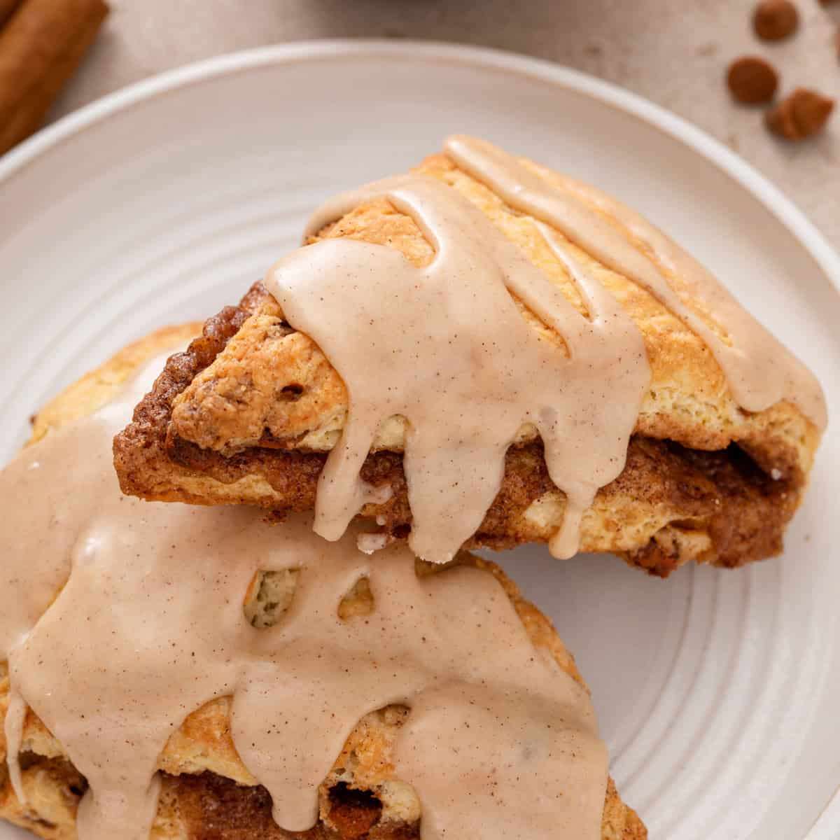 Tender cinnamon scones are made with cinnamon chips, a cinnamon-sugar filling, and a sweet glaze for the perfect scone for any cinnamon lover!