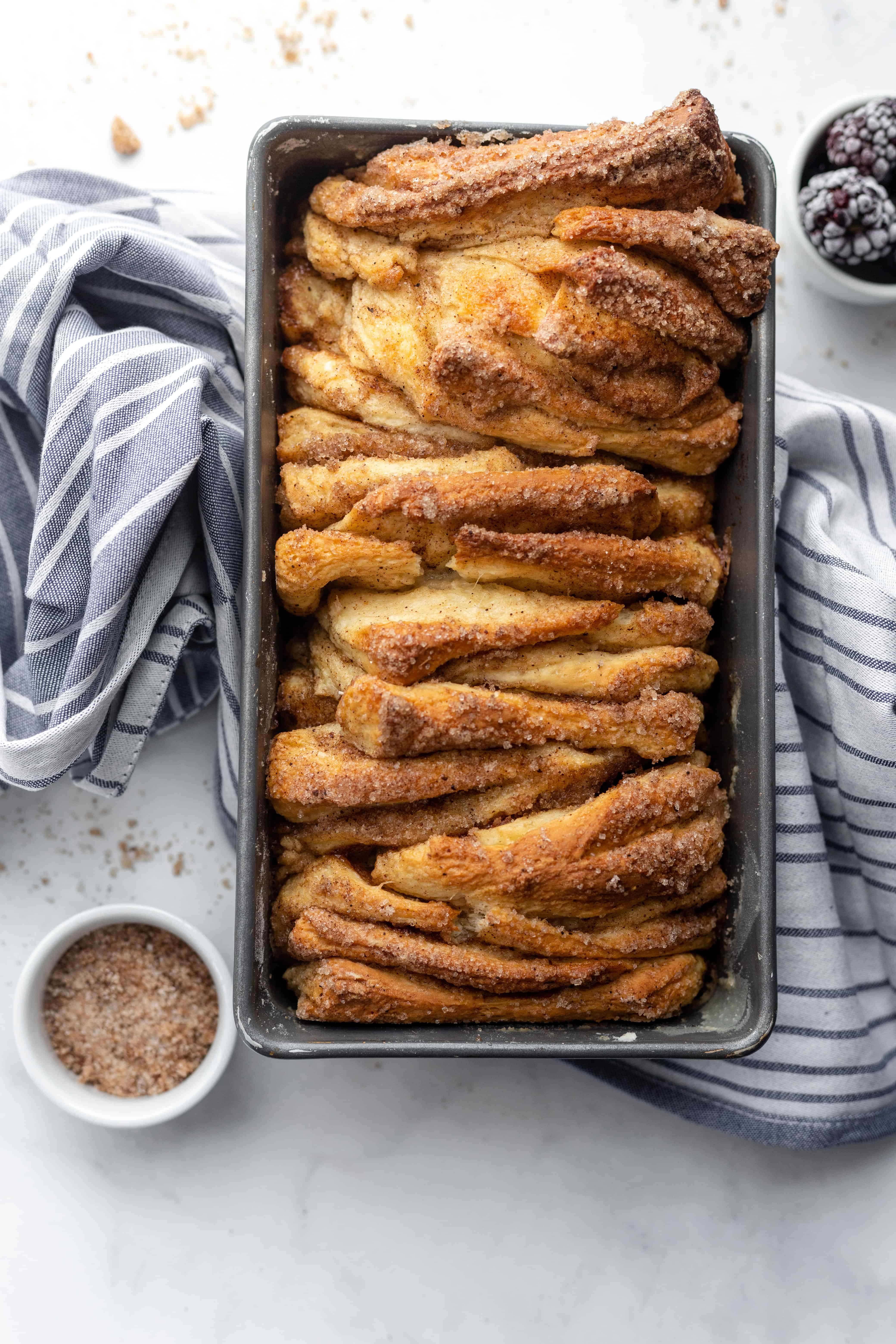 Pull apart squares of yeasted dough baked until golden brown, with a gooey cinnamon sugar filling in between each layer.