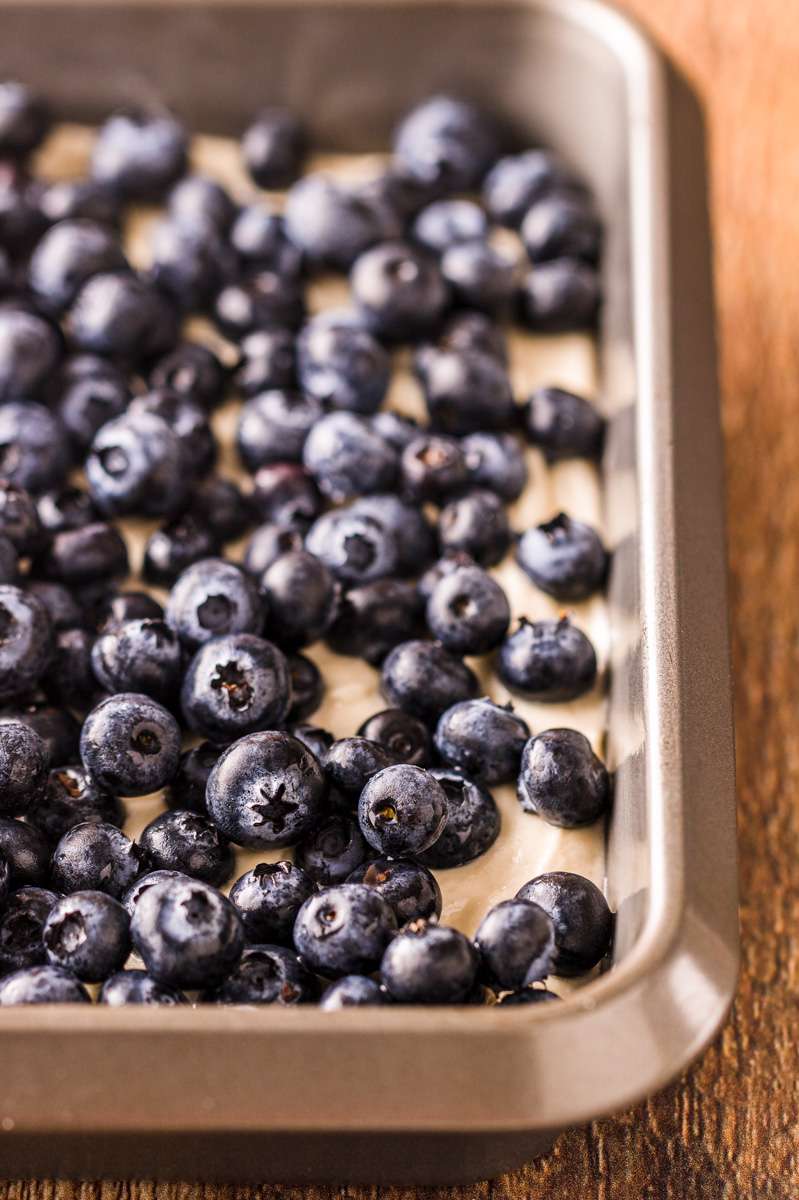- Spread in a greased 8×8 inch baking pan. Top with blueberries.
