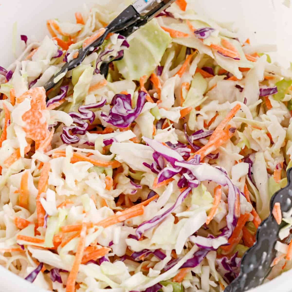 - Pour the dressing over the coleslaw mix and use a pair of tongs to toss everything together. Make sure the cabbage and carrots are well coated.