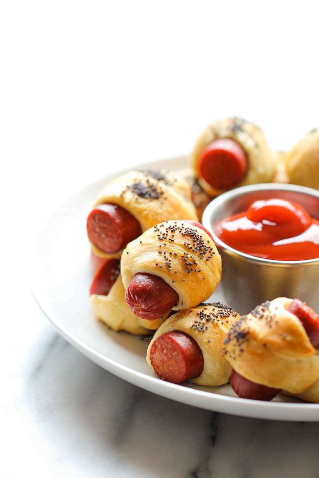 - Wrap each strip around each hot dog, leaving a little space at the edges. Sprinkle the tops with poppy seeds, if using.